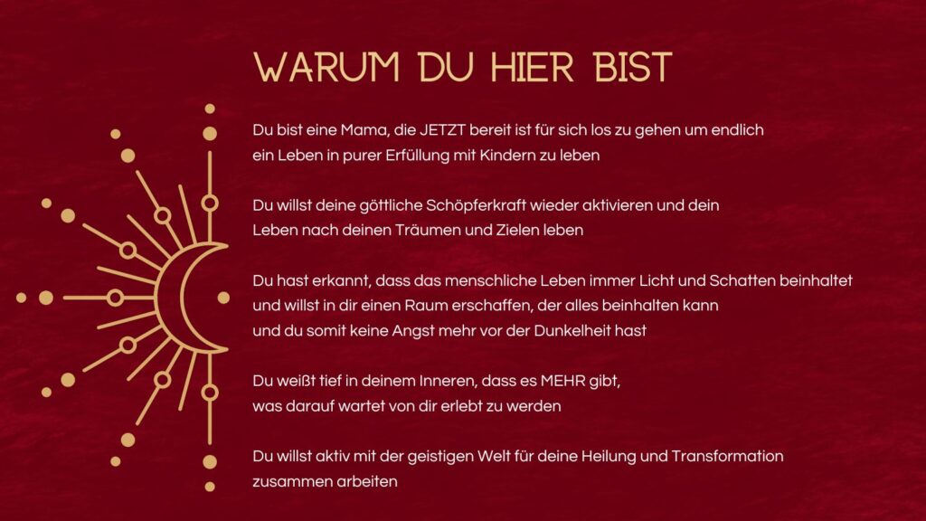 Ich erstelle nach und nach transformative kleine und große Onlinekurse zum Thema kraftvolles Mama Sein, Arbeiten mit der geistigen Welt und Ritualen, die dich bei bedeutenden Übergängen wirkungsvoll unterstützen können.